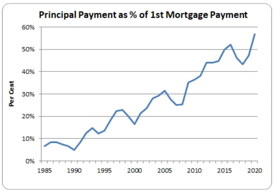 In the early 2000s, that percentage was 26.5%. The change is even more drastic when looking back at the 1990s, where just 11.9% of a homebuyer’s first payment went towards paying down the principal, or the 1980s, when that percentage was a minuscule 4.6%.